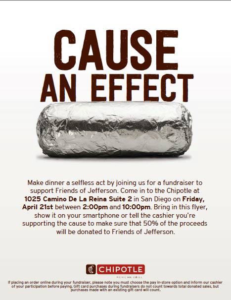 We are once again doing a “dine-out” fundraiser with Chipotle in Mission Valley–easiest fundraiser ever! Just show up between 2 PM and 10 PM, order a bunch of food, and make sure you let them know you’re there to support Friends of Jefferson. 50% of the proceeds go right to the foundation!