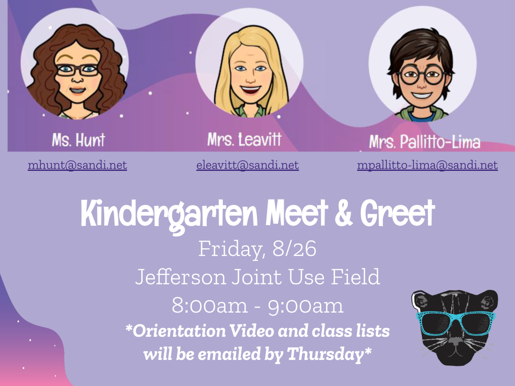 Note: Kinder orientation & class list will be emailed Thursday 8/25