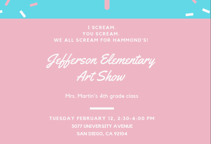 Join us at Hammond’s Gourmet Ice Cream for the opening of Mrs. Martin’s 4th grade class art show! You can meet some of the artists and see the ice cream-related art they created with Art Reach at the opening, from 2:30-4:00 PM on Tuesday, Feb. 12. If you can’t make it at that time, stop by and check out the art, which will remain on display for a limited time.